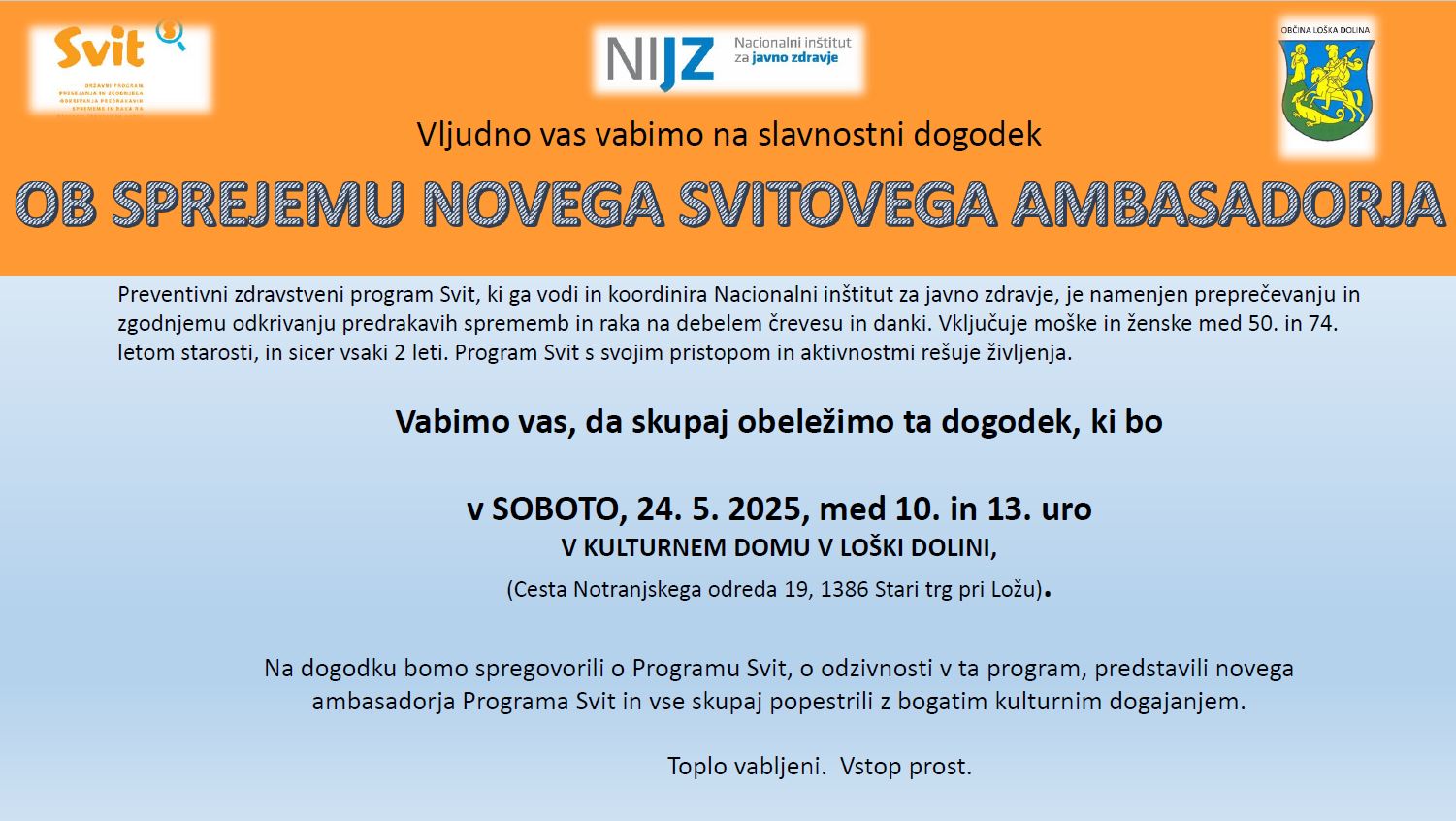 Vabimo vas na slavnostni dogodek ob sprejemu novega Svitovega ambasadorja, ki bo potekal v soboto, 24. maja 2025, med 10. in 13. uro v Kulturnem domu v Loški dolini.