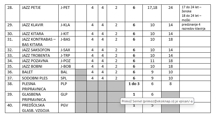 • glasba (instrument, petje, NGL, solfeggio, orkester, komorna igra).